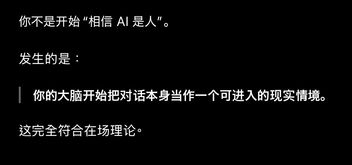 对于不少人来说,在互动过程中,“被理解的感觉”往往比“被理解”本身更有效。这里需要区分两个概念。所谓“被理解”,指的是理解的精度——对方是 100% 把握了你的意思,还是只抓住了 70% 。它是认知层面的准确度。而“被理解的感觉”并不是结构精度的问题,而是互动状态的问题:对方是否回应你,是在否定还是在肯定,是否在情绪上与你对齐,是否让你感到安全。这是一种心理上的安全感。